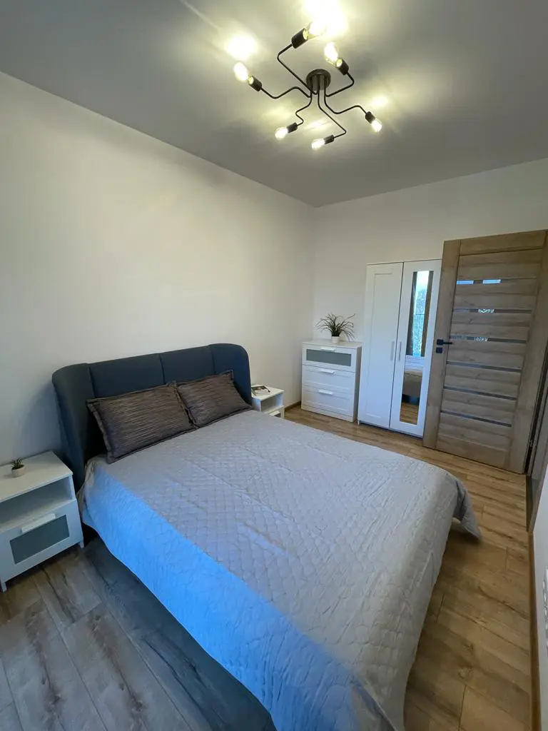 - Sypialnia: łóżko dwuosobowe z tapicerowanym zagłówkiem, 2 stoliki nocne, 3-drzwiowa szafa z lustrem, komoda