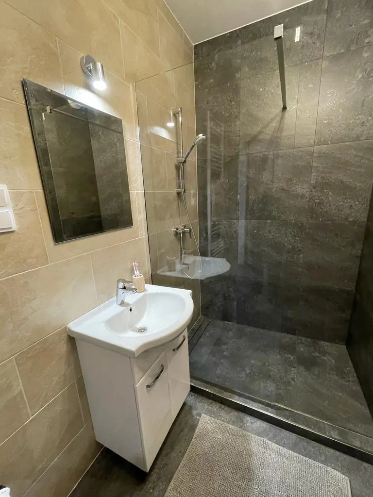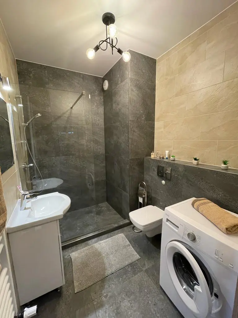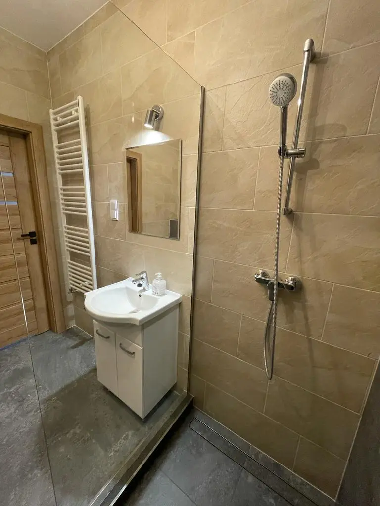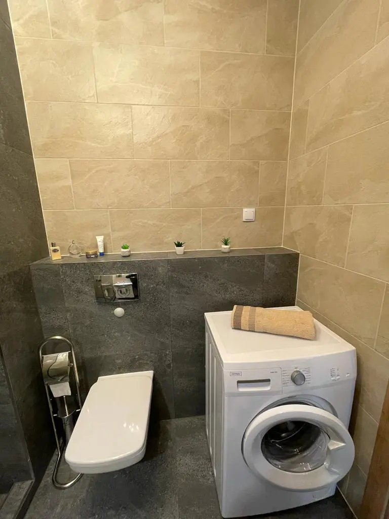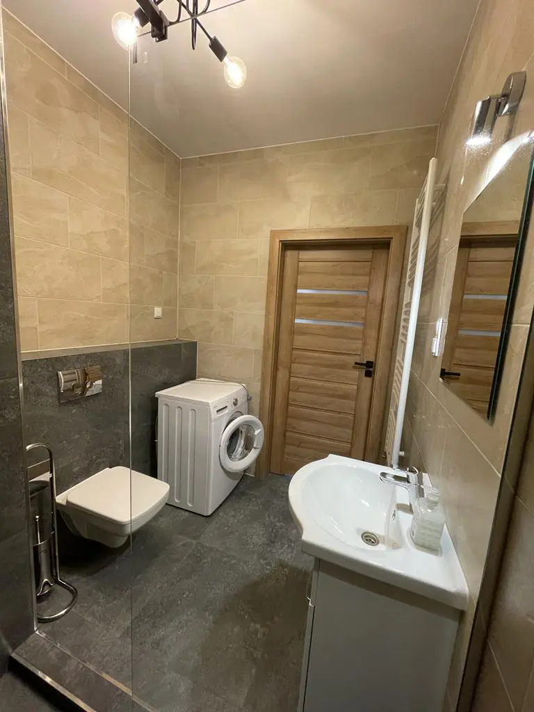 - Łazienka: kabina prysznicowa, toaleta, umywalka, lustro, pralka