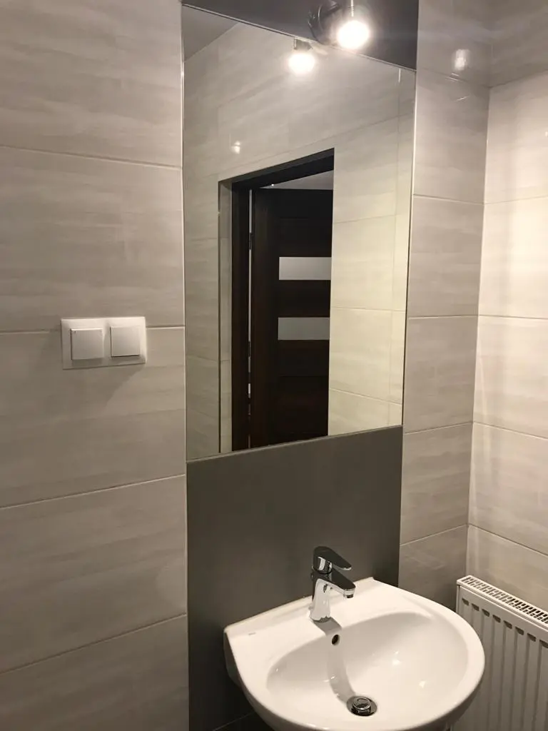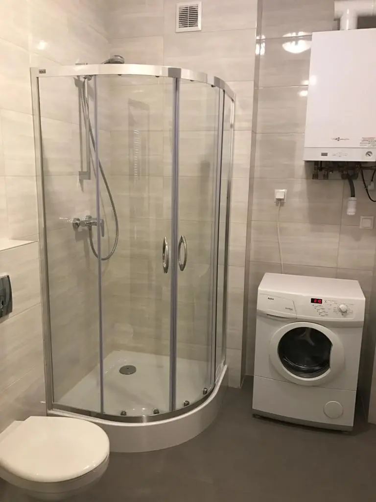 Aneks kuchenny wyposażony jest w meble oraz niezbędny sprzęt kuchenny (płyta indukcyjna z piekarnikiem, zlew, lodówka z zamrażalnikiem, pochłaniacz). Łazienka jest wykafelkowana i całkowicie urządzona (kabina prysznicowa, toaleta, umywalka, lustro) oraz wyposażona w pralkę. Na podłodze pokoju znajdują się panele, natomiast w łazience i aneksie kuchennym płytki. Ściany są pomalowane. Mieszkanie wyposażone jest w drzwi wewnętrzne i zewnętrzne, karnisze, stolarkę okienną (PCV) wraz z elektrycznie sterowanymi zewnętrznymi roletami. W mieszkaniu zainstalowane są lampy, osprzęt elektrotechniczny i domofon, a także dwufunkcyjny kocioł centralnego ogrzewania firmy VIESSMANN oraz grzejniki.