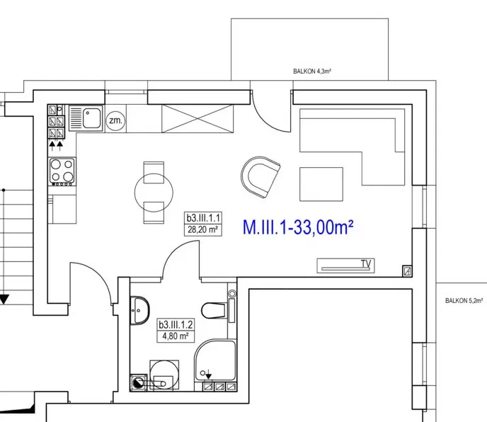 Pomieszczenia pokój z aneksem kuchennym, łazienka oraz dodatkowo balkon.