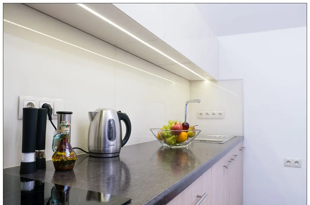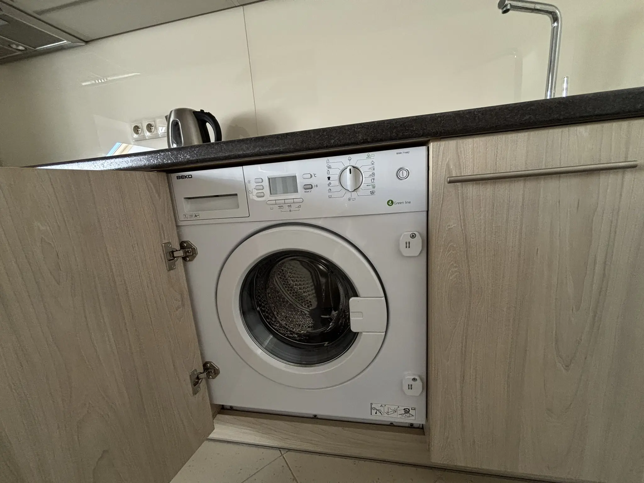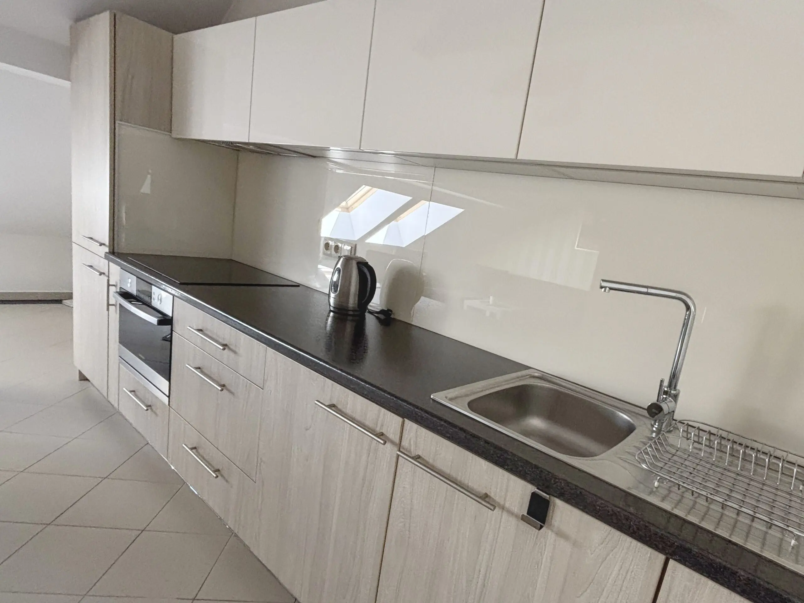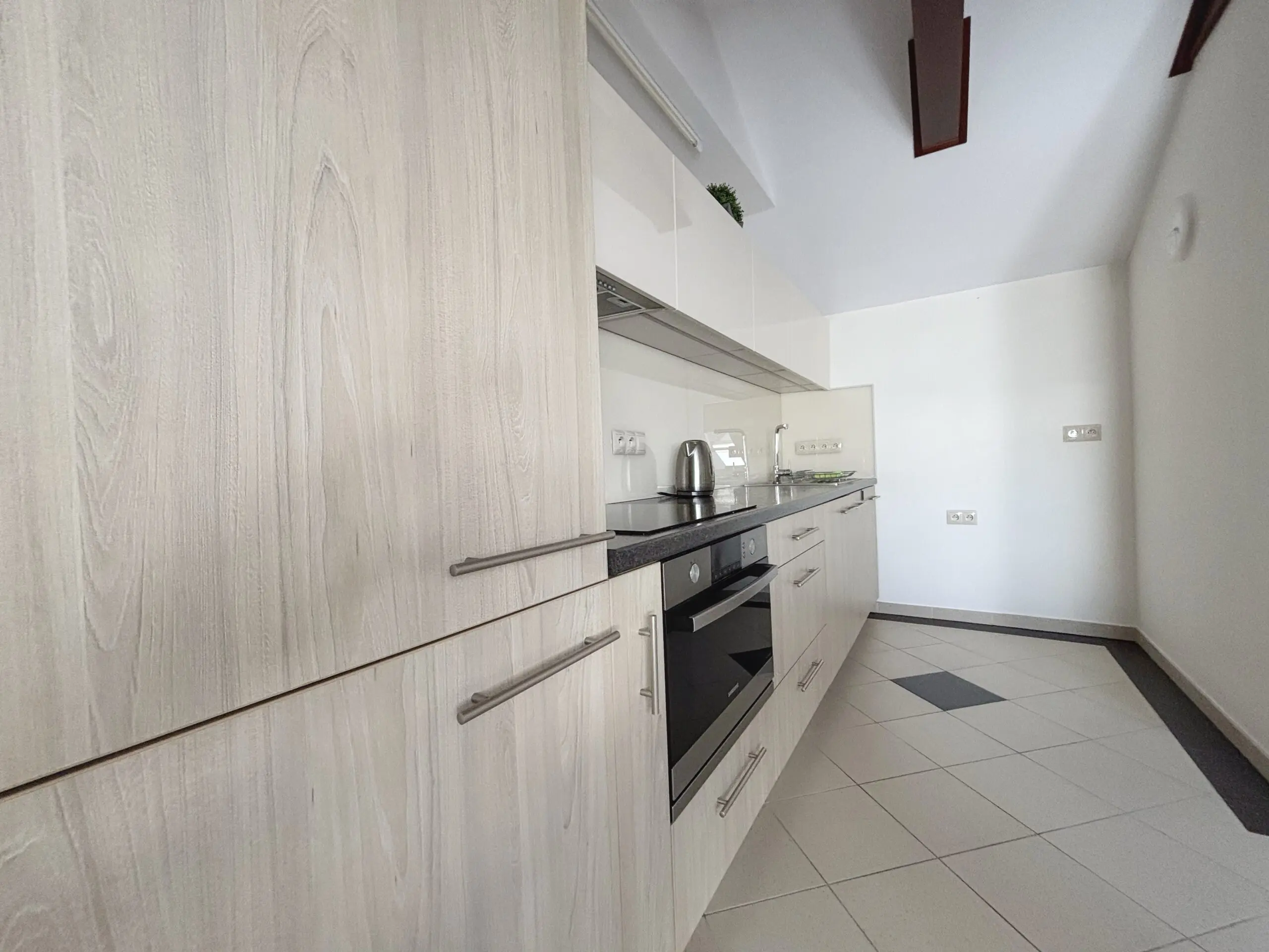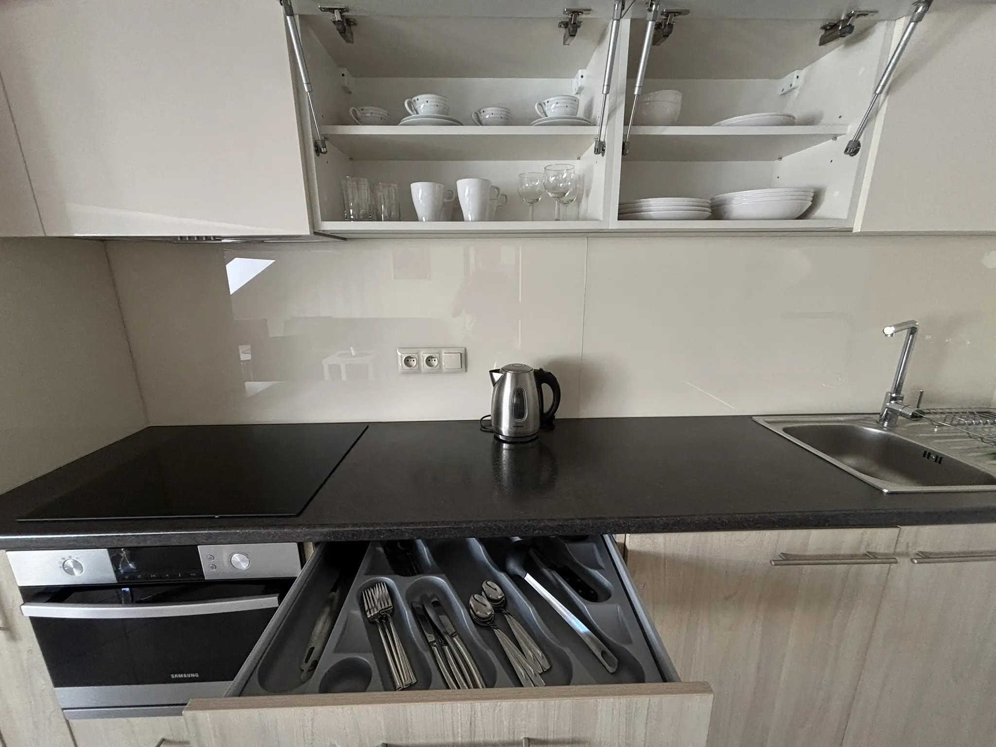 meble kuchenne, płyta indukcyjna, lodówka, zamrażarka, piekarnik kompaktowy z funkcją mikrofali, pochłaniacz, czajnik elektryczny, zlew, pralka, naczynia, garnki, patelnia, sztućce.