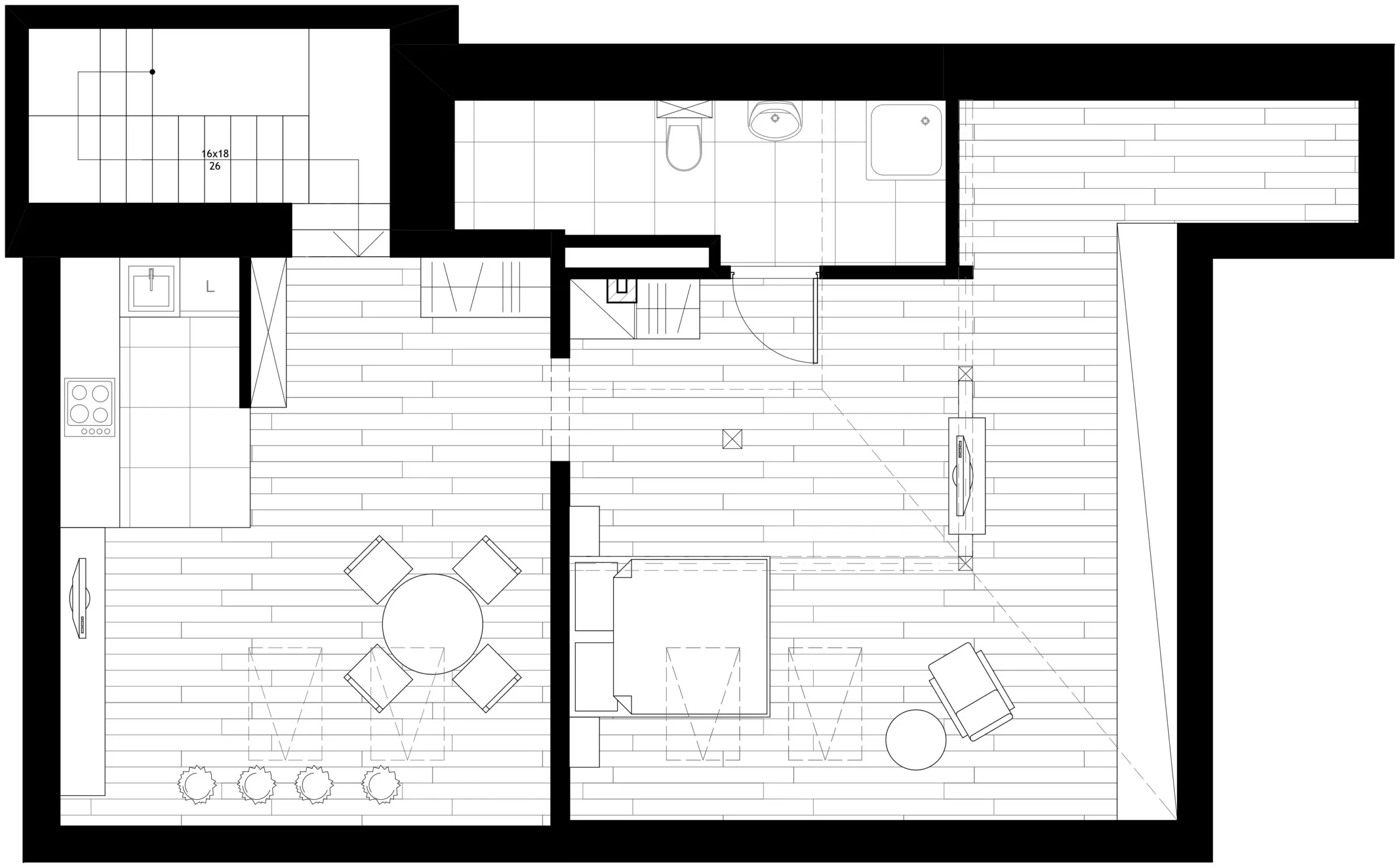 Pomieszczenia pokój dzienny z aneksem kuchennym, sypialnia, łazienka, klatka schodowa (do własnej dyspozycji).