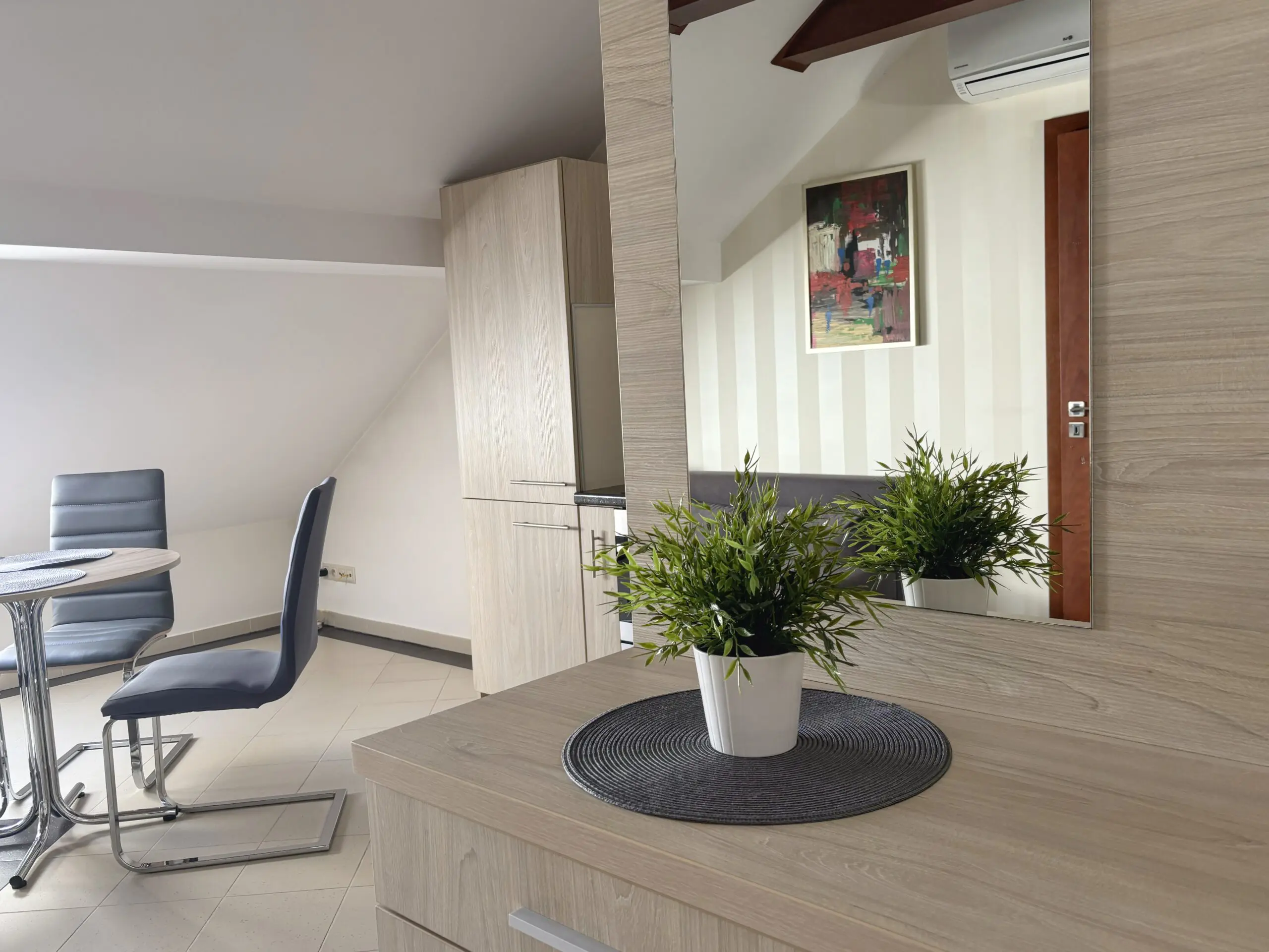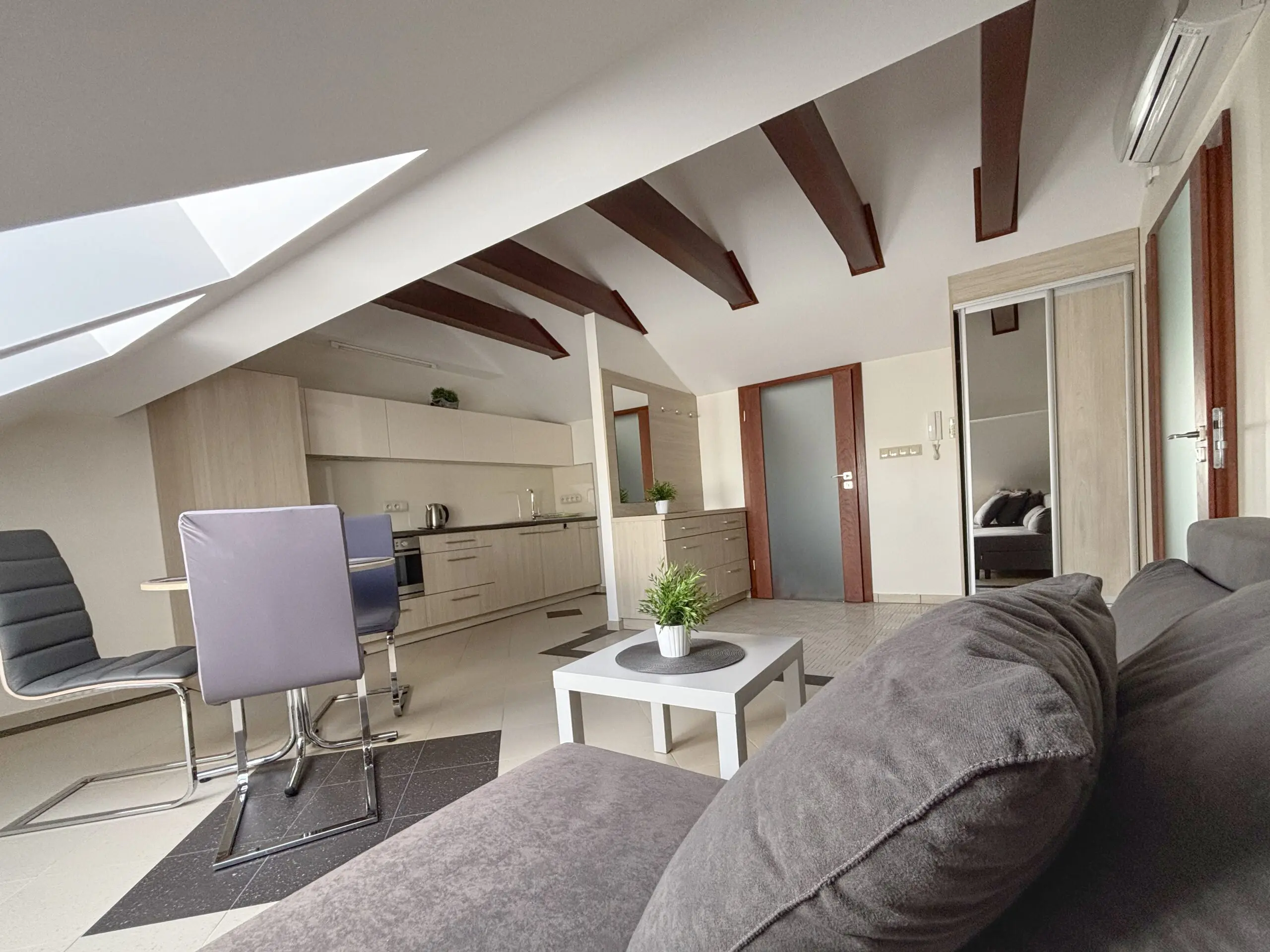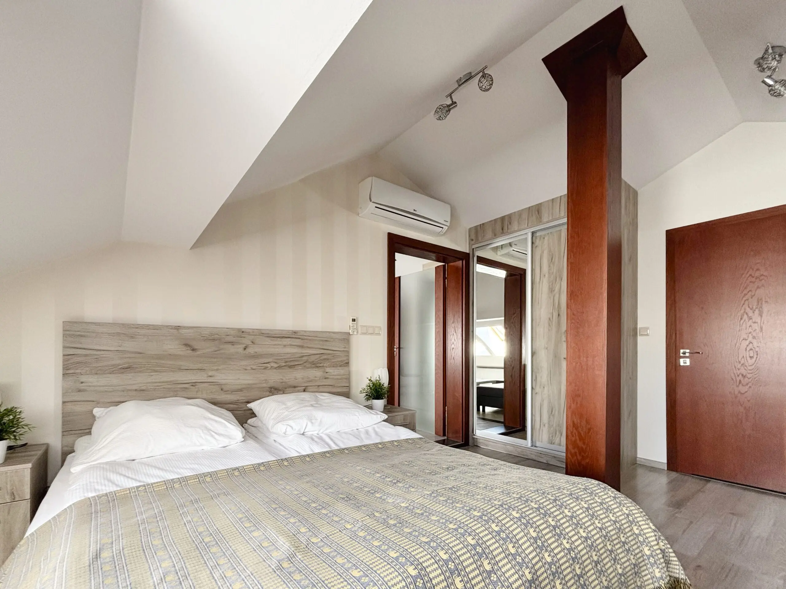 Całkowicie umeblowane i wyposażone, klimatyzowane 2-pokojowe mieszkanie na 1 piętrze (ostatnie piętro). Własne niezależne wejście z klatką schodową i dostęp do małego ogrodu. Media, klimatyzacja, wifi i parking w cenie.