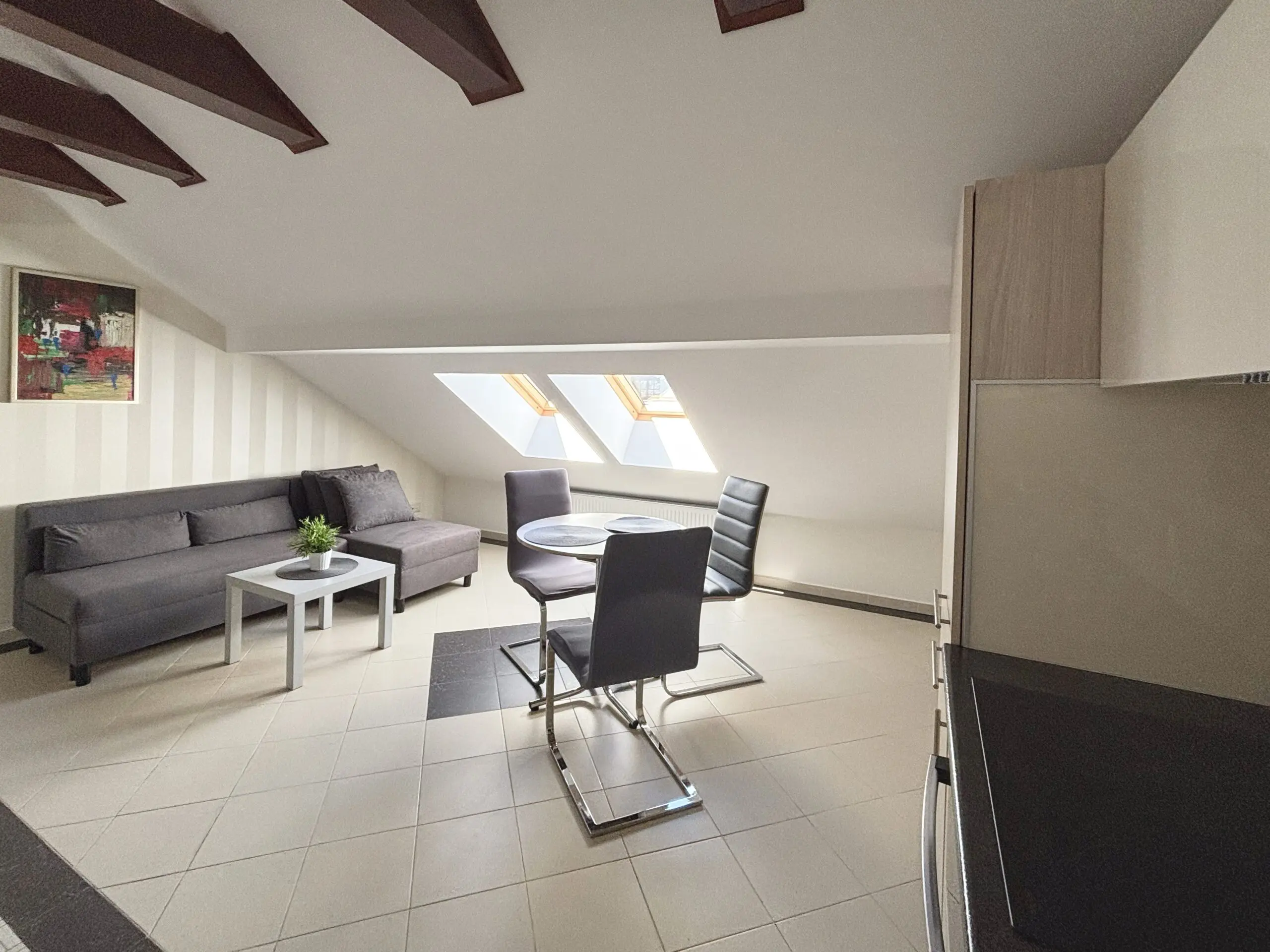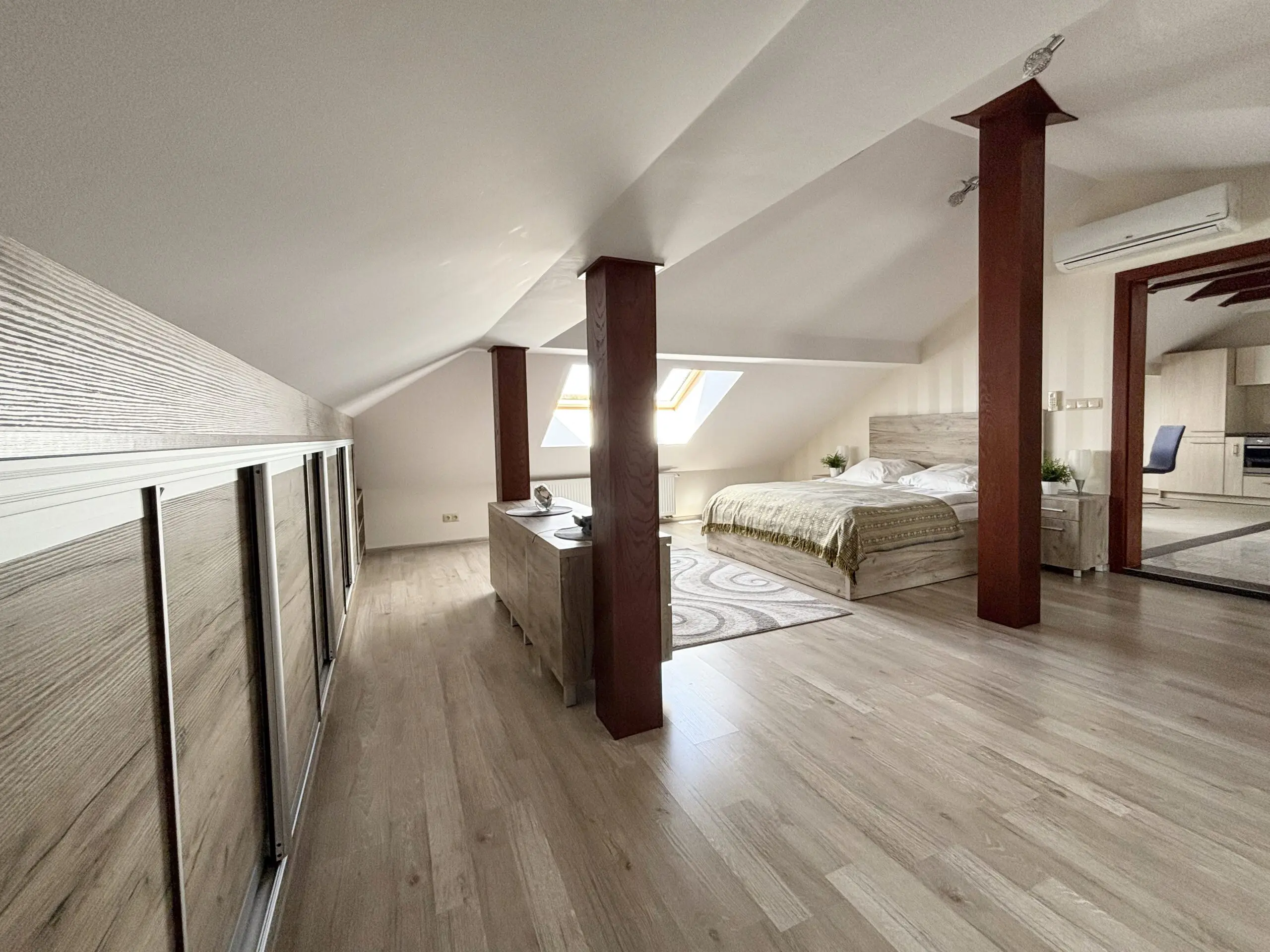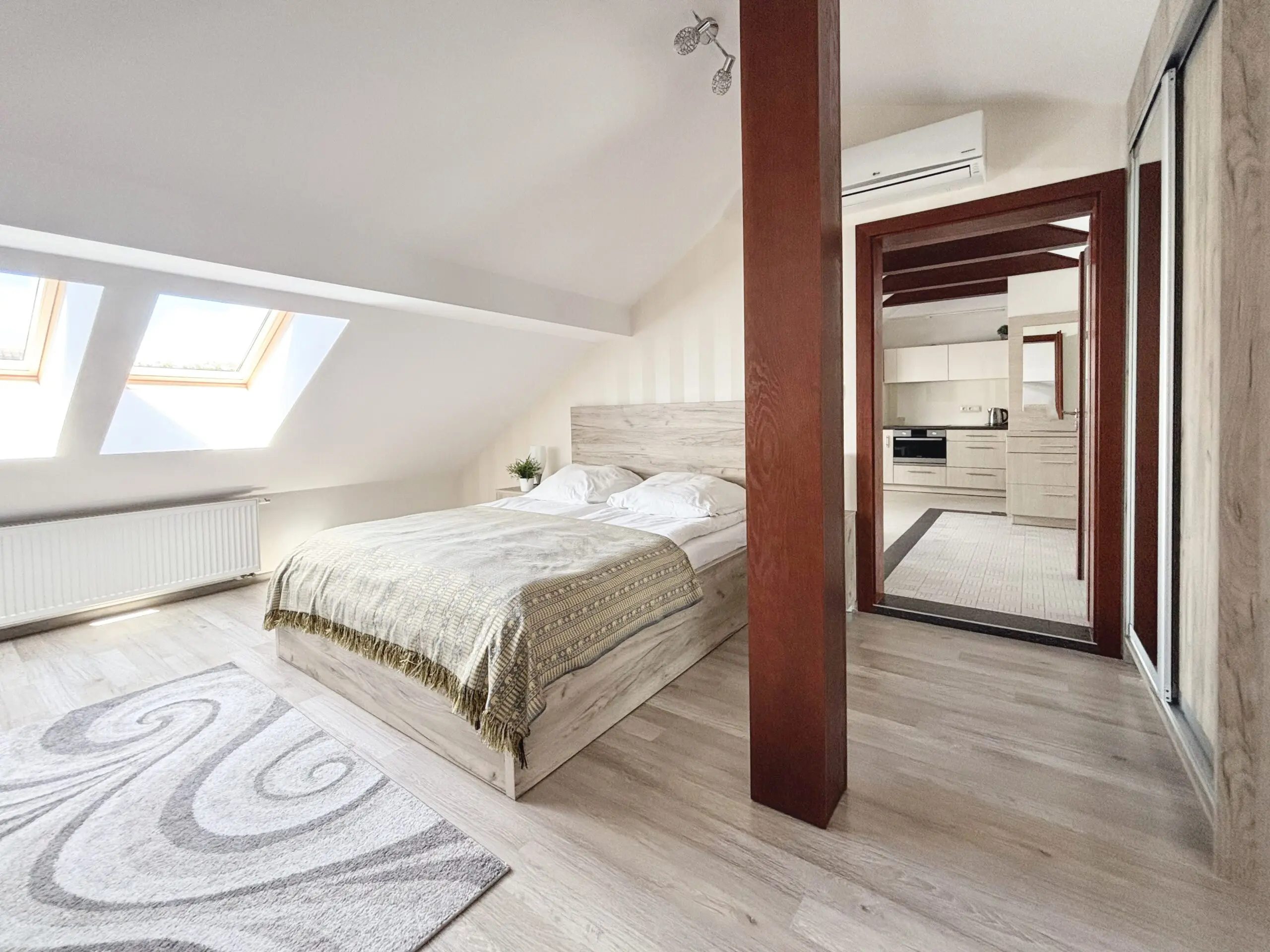 Całkowicie umeblowane i wyposażone, klimatyzowane 2-pokojowe mieszkanie na 1 piętrze (ostatnie piętro). Własne niezależne wejście z klatką schodową i dostęp do małego ogrodu. Media, klimatyzacja, wifi i parking w cenie.