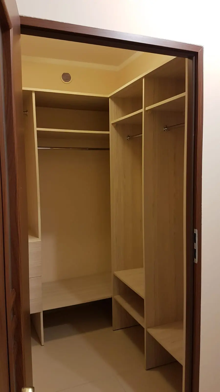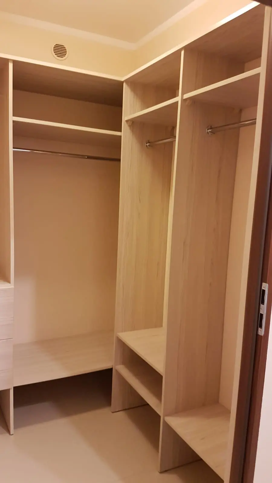 wnękowa szafa ubraniowa z drążkami, szufladami i półkami otwartymi.
