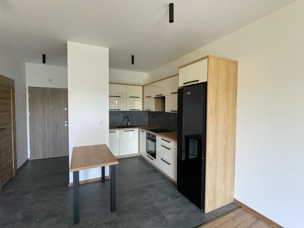 Na mieszkanie składają się następujące pomieszczenia: pokój z aneksem kuchennym, łazienka, sypialnia, przedpokój i loggia. Z salonu oraz z sypialni wyjście na loggię skierowaną na zachód. Aneks kuchenny wyposażony jest w meble kuchenne oraz niezbędny sprzęt kuchenny (kuchnia elektryczna z płytą indukcyjną i piekarnikiem, zlew, chłodziarko-zamrażarka, pochłaniacz i zmywarka oraz stół). W przedpokoju znajduje się przestronna szafa ubraniowa. Łazienka jest wykafelkowana i całkowicie urządzona (kabina prysznicowa, toaleta, umywalka, lustro, pralka). Na podłodze pokoi znajdują się panele, natomiast w łazience, przedpokoju i aneksie kuchennym płytki. Ściany są pomalowane. Mieszkanie wyposażone jest w drzwi wewnętrzne i zewnętrzne, karnisze, stolarkę okienną (PCV). W mieszkaniu zainstalowane są lampy, osprzęt elektrotechniczny i domofon oraz grzejniki.