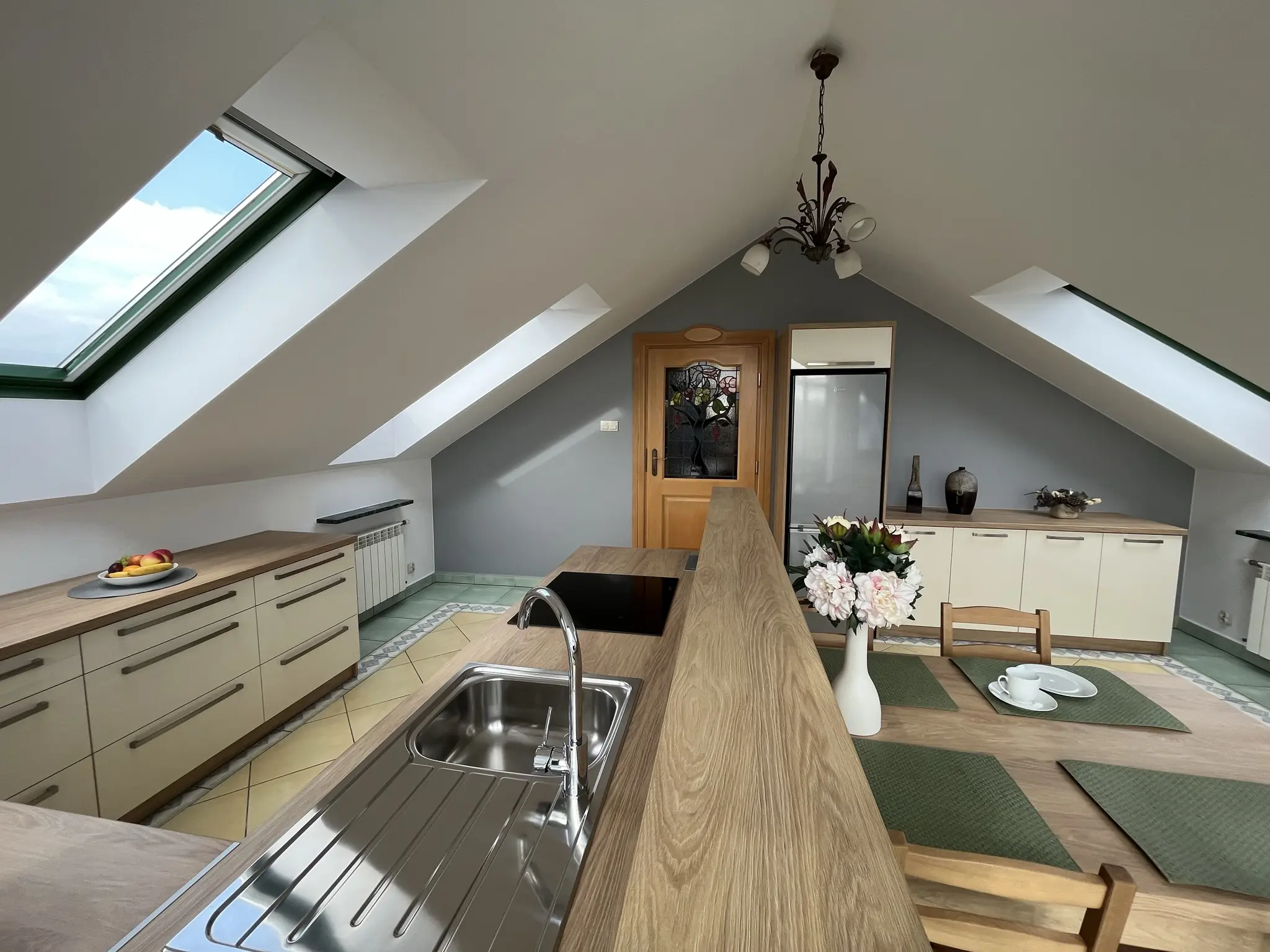 Duże, komfortowe, całkowicie umeblowane mieszkanie, z garażem, dodatkowym miejscem parkingowym na ogrodzonym podwórku  oraz dostępem do dużego ogrodu skierowanego na południe. W cenie media (dodatkowa opłata zryczałtowana), wifi, garaż oraz miejsce parkingowe.