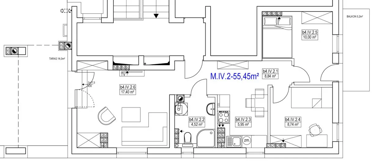 Pomieszczenia salon, sypialnia, (2 szt), kuchnia, łazienka, przedpokój oraz dodatkowo balkon i taras.