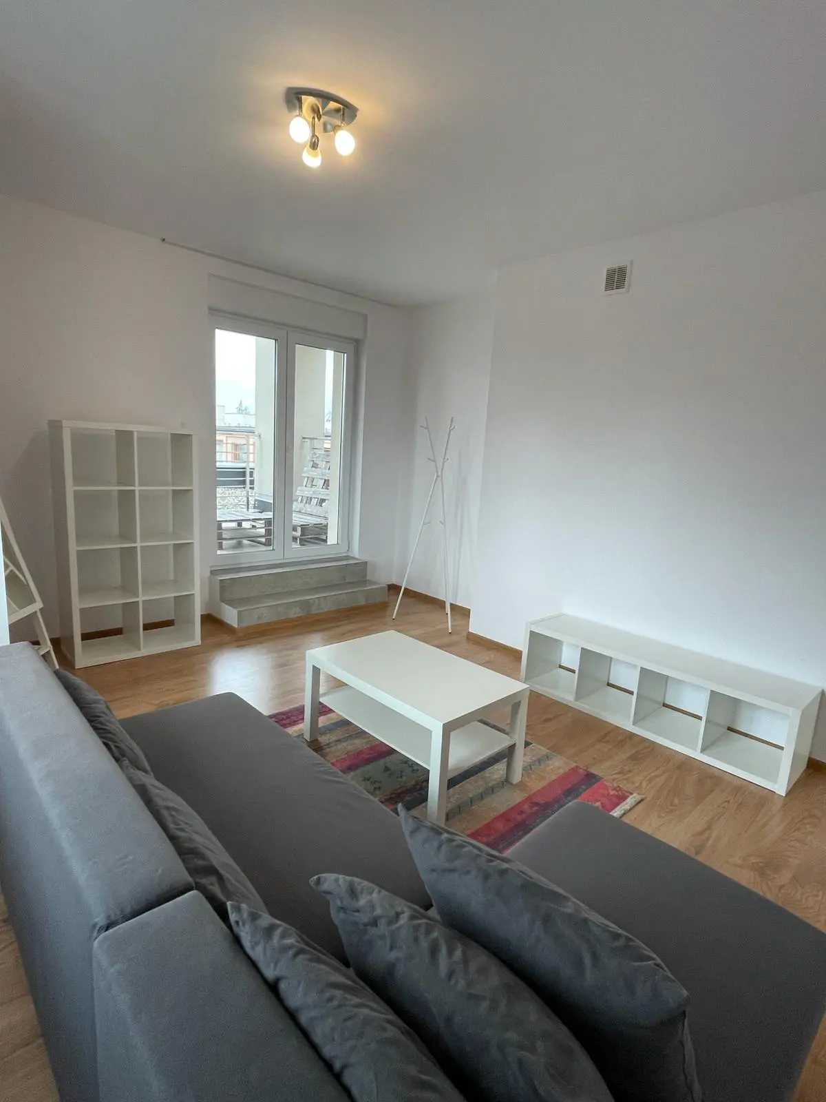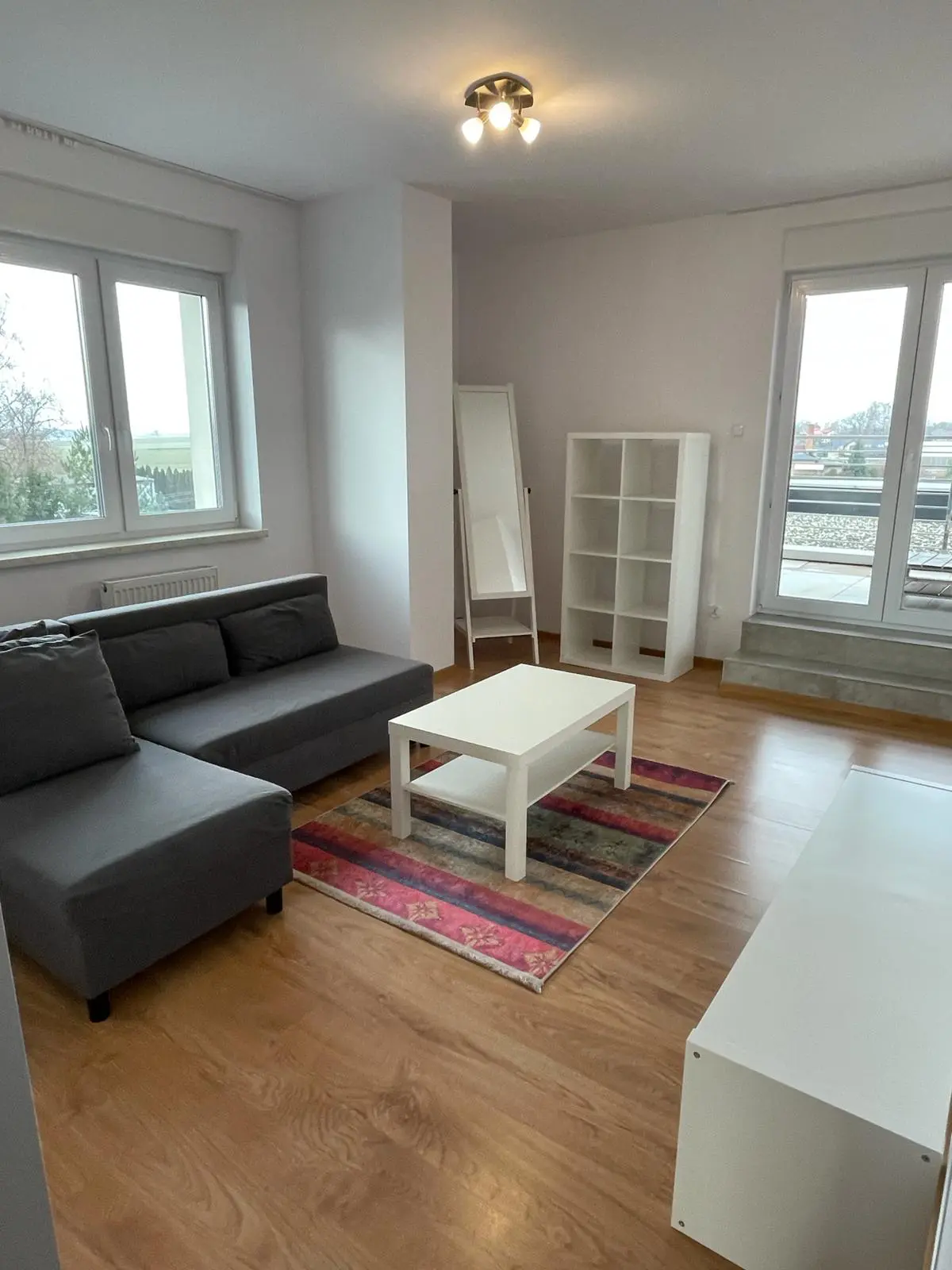 Umeblowane, mieszkanie 3-pokojowe typu penthouse z balkonem i tarasem na 3 piętrze (ostatnie piętro budynku). Osobna kuchnia. Rolety zewnętrzne. Media, komórka lokatorska i parking w cenie.