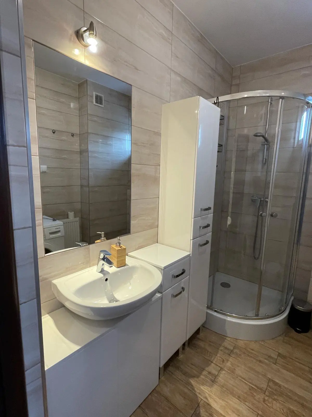 Mieszkanie jest całkowicie umeblowane. Kuchnia wyposażona jest w meble oraz niezbędny sprzęt kuchenny (kuchnia elektryczna z płytą indukcyjną i piekarnikiem, zlew, chłodziarko-zamrażarka, pochłaniacz), jak również stół kuchenny i krzesła (3 szt), zegar ścienny. W salonie znajdują się: sofa z funkcją spania dla 2 osób, stolik okolicznościowy, regał, półka rtv, lustro stojące. W sypialni znajdują się: łoże małżeńskie, szafka nocna (2 szt). W pokoju znajdują się: duża szafa z lustrem, biurko, półka, krzesło, komoda (2 szt), wieszak na ubrania stojący. Łazienka jest wykafelkowana i całkowicie urządzona (kabina prysznicowa, toaleta, umywalka, lustro). W łazience znajdują się ponadto: pralka, szafa łazienkowa, półka, półka podumywalkowa. W przedpokoju znajduje się półka na buty. Na podłodze pokoi znajdują się panele, natomiast w łazience i kuchni płytki. Ściany są pomalowane. Mieszkanie wyposażone jest w drzwi wewnętrzne i zewnętrzne, karnisze, stolarkę okienną (PCV) wraz z elektrycznie sterowanymi zewnętrznymi roletami. W mieszkaniu zainstalowane są lampy, osprzęt elektrotechniczny i domofon, a także dwufunkcyjny kocioł centralnego ogrzewania firmy VIESSMANN oraz grzejniki.
