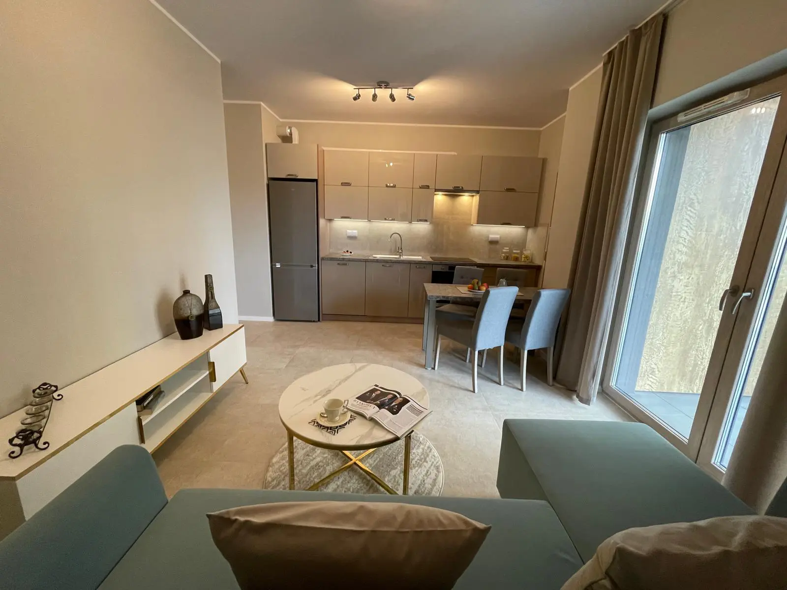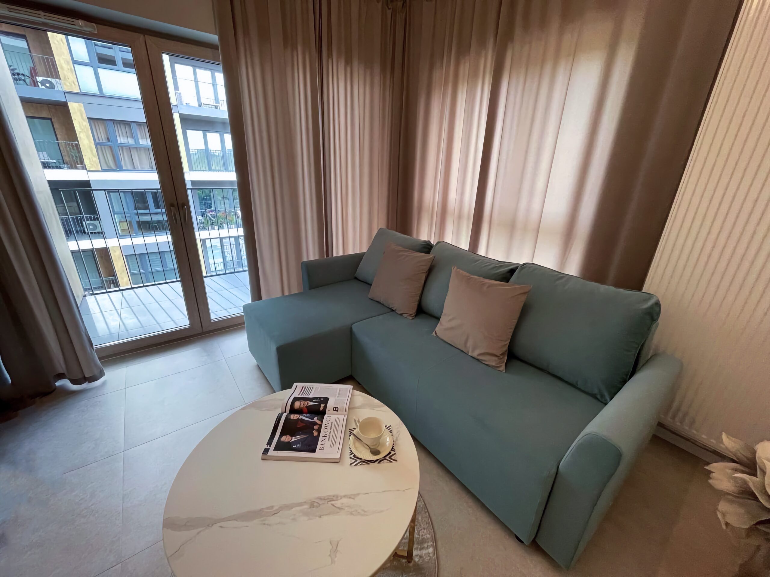 Aneks kuchenny wyposażony jest w meble kuchenne oraz niezbędny sprzęt kuchenny (kuchnia elektryczna z płytą indukcyjną i piekarnikiem, zlew, chłodziarko-zamrażarka, pochłaniacz i zmywarka oraz stół i 4 krzesła). Częścią aneksu kuchennego jest mała, lecz funkcjonalna spiżarka oddzielona od aneksu drzwiami. W przestronnym salonie znajdują się: rozkładana sofa, stolik okolicznościowy i półka RTV. Sypialnia jest wyposażona w wygodne łoże małżeńskie, szafki nocne i pojemną szafę. Trzeci pokój, który może pełnić funkcję drugiej sypialni lub gabinetu, pozostawiamy do samodzielnej aranżacji, aby sprostać indywidualnym potrzebom najemcy. Na życzenie i za dodatkową opłatą możemy wyposażyć go zgodnie z Państwa preferencjami.