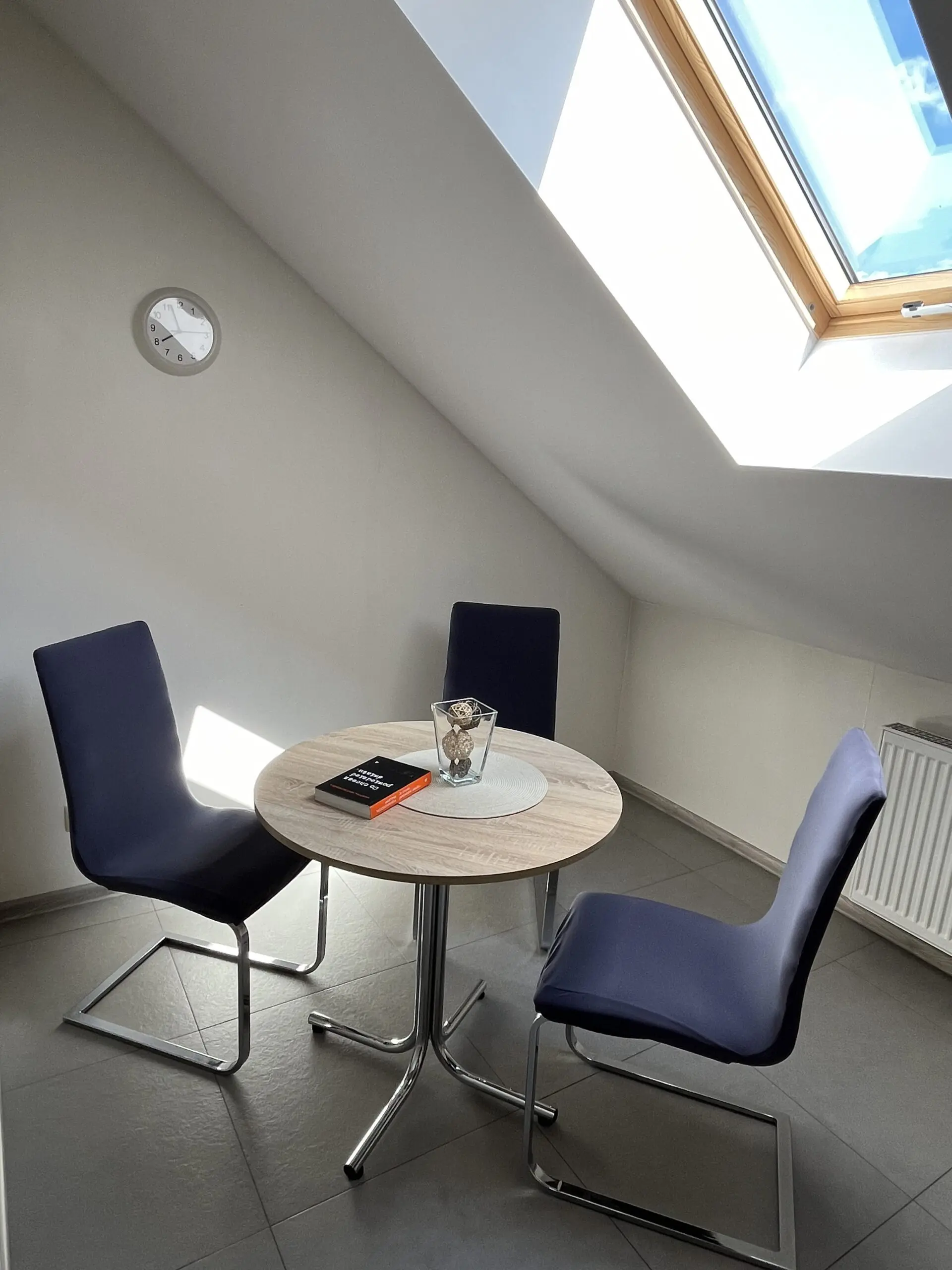 meble kuchenne, stół okrągły, krzesło (3 szt.), płyta indukcyjna, lodówka z zamrażalnikiem, piekarnik kompaktowy z funkcją mikrofali, pochłaniacz, czajnik elektryczny, zlew, naczynia, garnki, patelnia, sztućce.