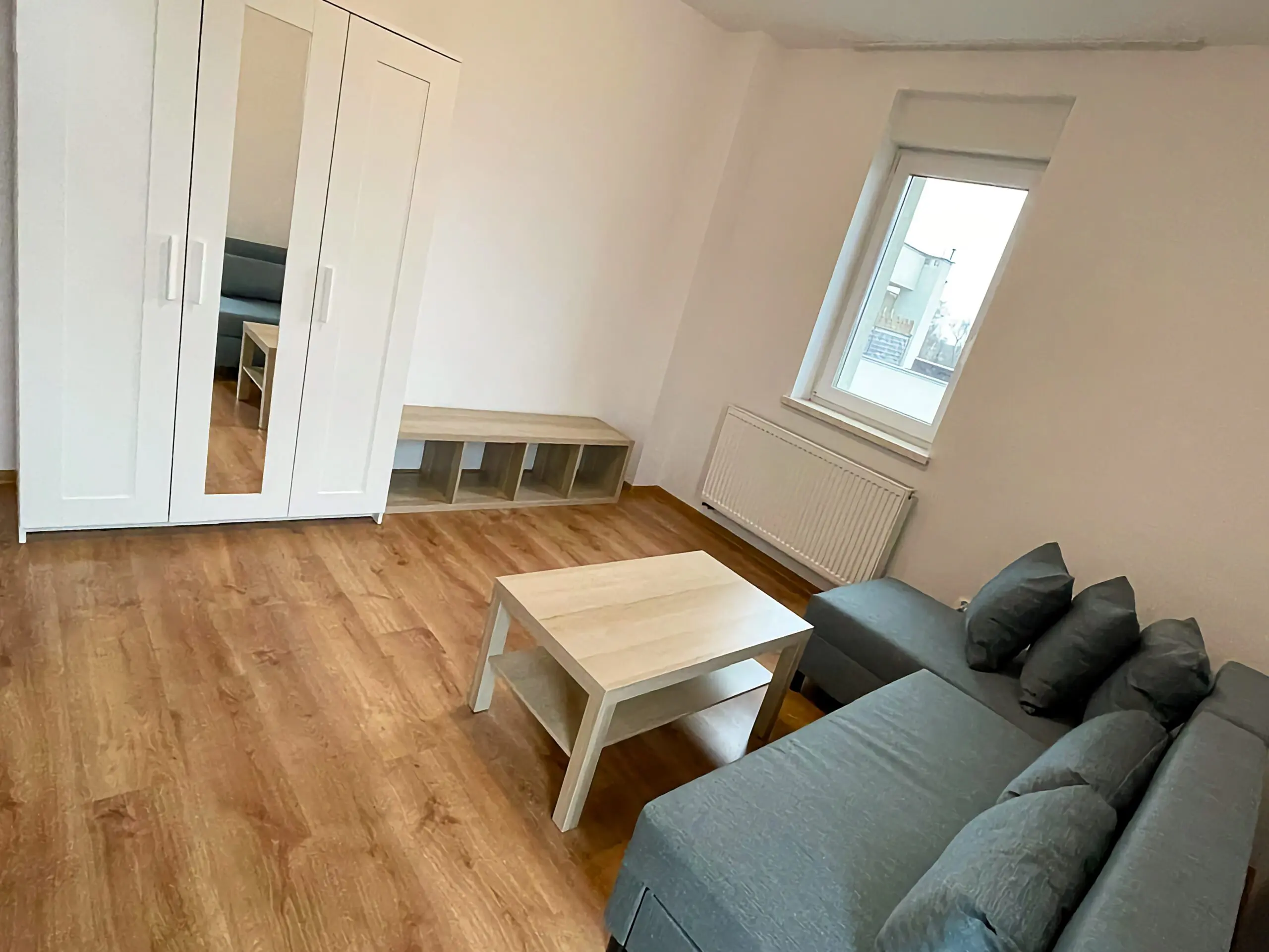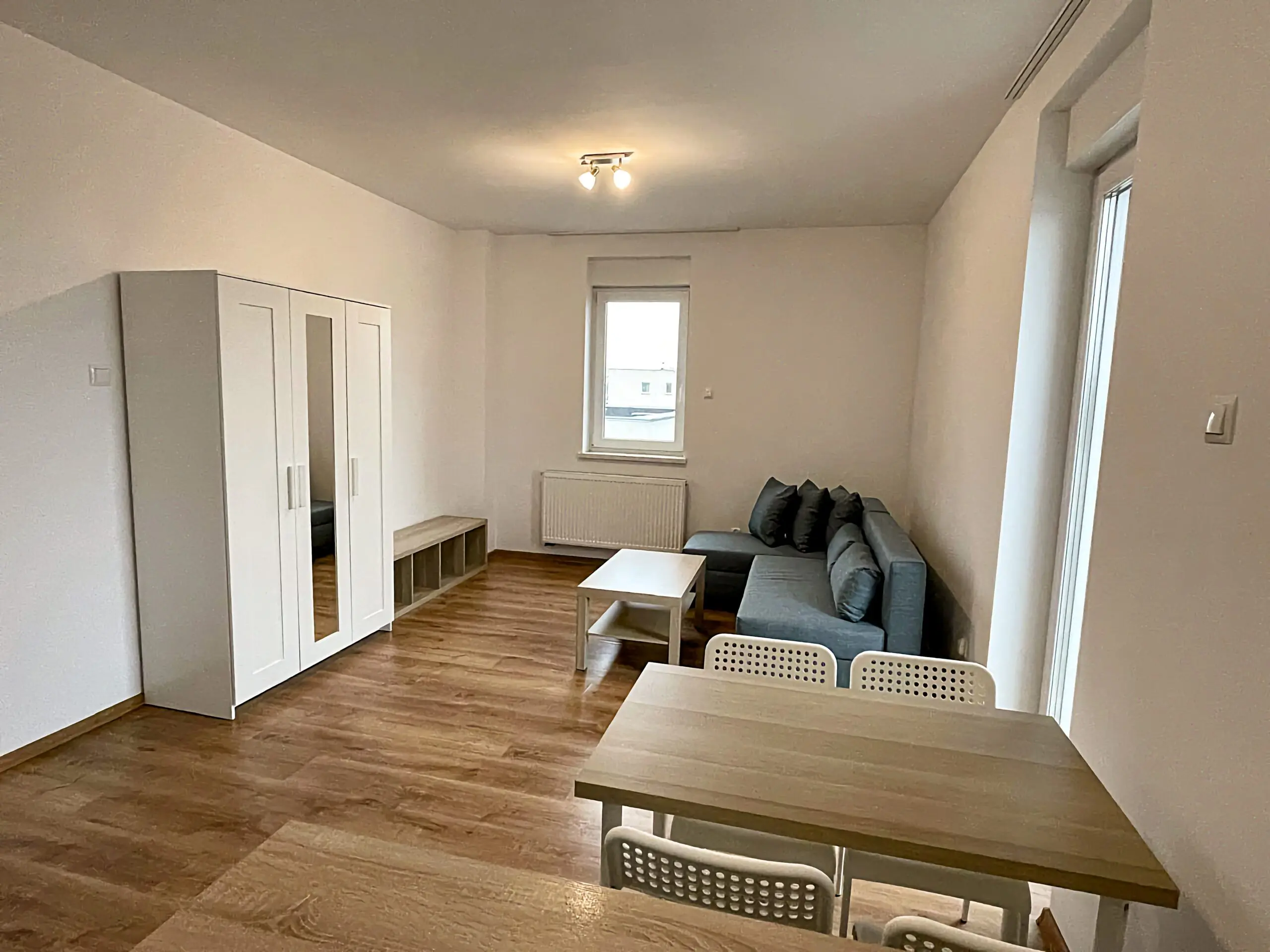 Mieszkanie składa się z dużego salonu z aneksem kuchennym i jest gotowe do natychmiastowego zamieszkania. Pokój bardzo dobrze doświetlony, okno skierowane na zachód. Z salonu wyjście na balkon. Okna i drzwi balkonowe wyposażone w rolety zewnętrzne. Doskonały stosunek ceny do funkcjonalności.