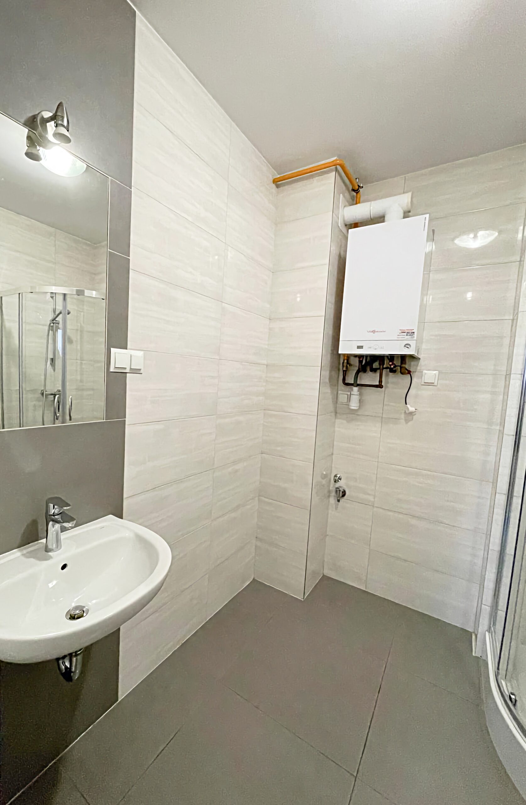 Aneks kuchenny wyposażony jest w meble oraz niezbędny sprzęt kuchenny (płyta indukcyjna z piekarnikiem, zlew, chłodziarko-zamrażarka, pochłaniacz) oraz stół i 4 krzesła. Salon wyposażony jest w podstawowe meble: rozkładana sofa narożna z funkcją spania dla 2 osób, stolik okolicznościowy, szafa 3-drzwiowa z lustrem, regał. Łazienka jest wykafelkowana i całkowicie urządzona (kabina prysznicowa, toaleta, umywalka, lustro). Na podłodze pokoju znajdują się panele, natomiast w łazience i aneksie kuchennym płytki. Ściany są pomalowane. Mieszkanie wyposażone jest w drzwi wewnętrzne i zewnętrzne, karnisze, stolarkę okienną (PCV) wraz z elektrycznie sterowanymi zewnętrznymi roletami. W mieszkaniu zainstalowane są lampy, osprzęt elektrotechniczny i domofon, a także dwufunkcyjny kocioł centralnego ogrzewania firmy VIESSMANN oraz grzejniki.